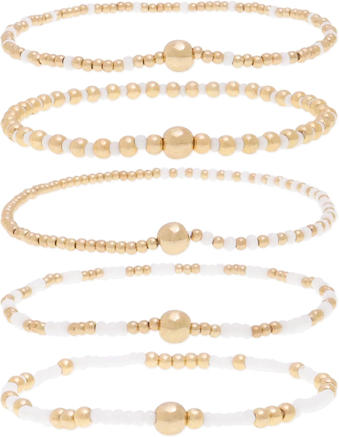 Rainbow White Beads Stack Bracelets for Women, 5Pcs Cute Boho Handmade Gold Beaded Stackable Stretch Bracelet Everyday Fashion Jewelry Gift.