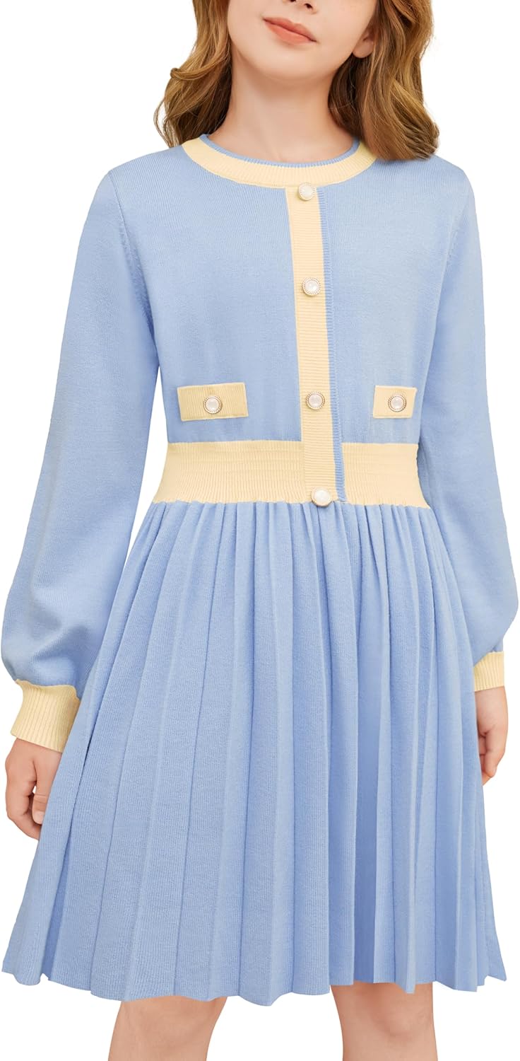 Cubear Girls Sweater Dress with Pockets, Crewneck Lantern Sleeve A-Line Striped Knit Warm Fall Winter Dress 5-14Y