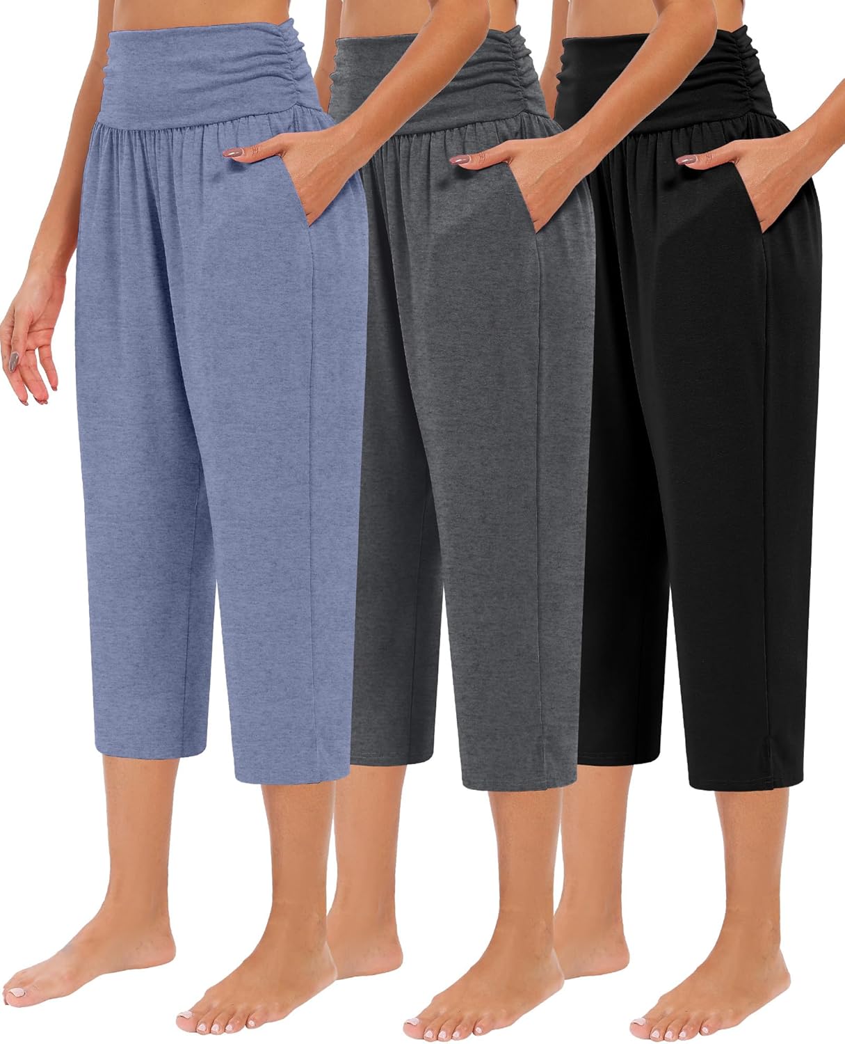 Neer 3 Pack Capri Pants for Women Casual Summer Lounge Yoga Pants Crop High Waist Loose Fit Sweatpants Pajamas with Pockets
