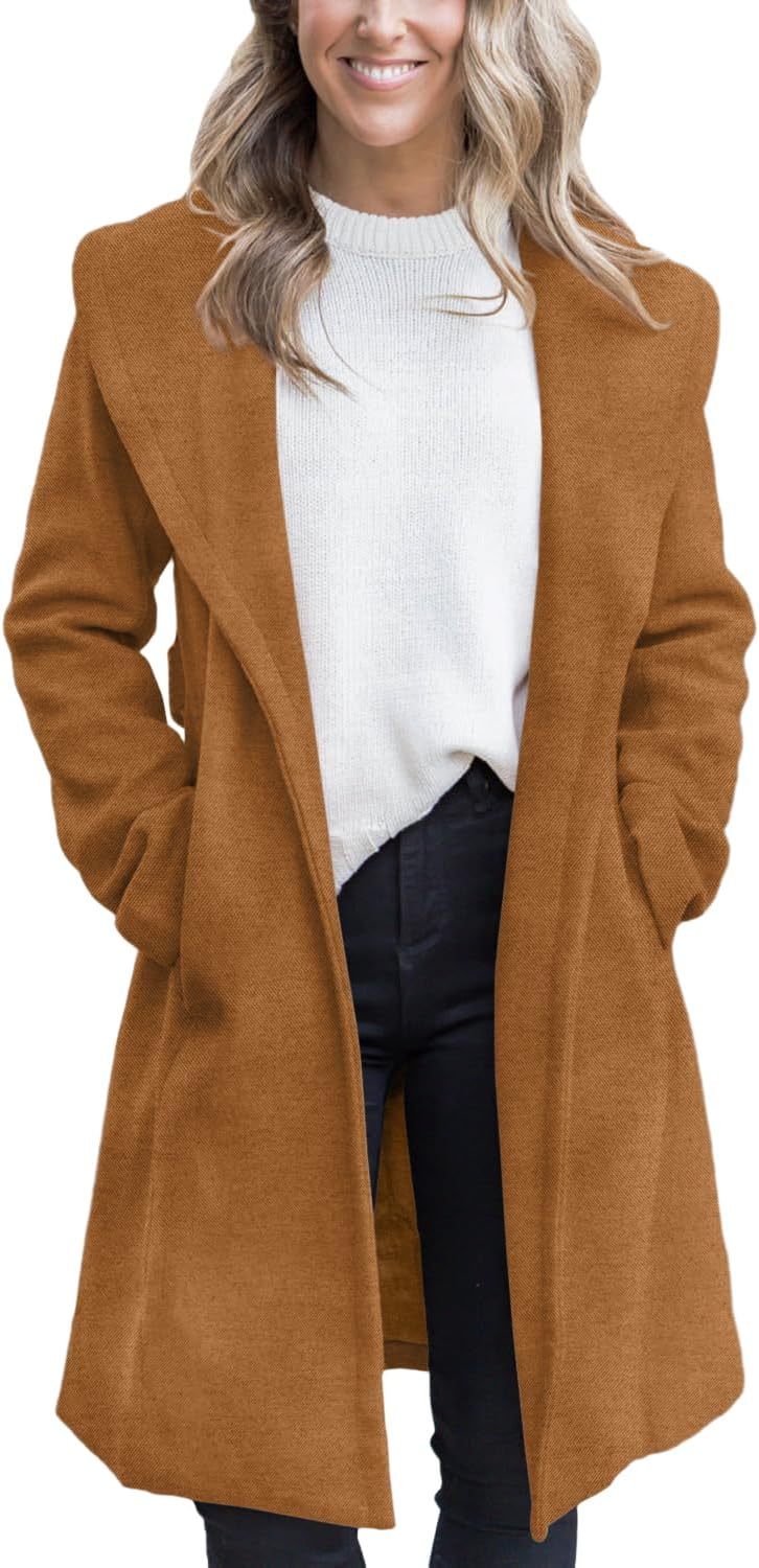 Fazortev Women's Winter Pea Coat Big Lapel Open Front Long Jackets Belted With Pockets