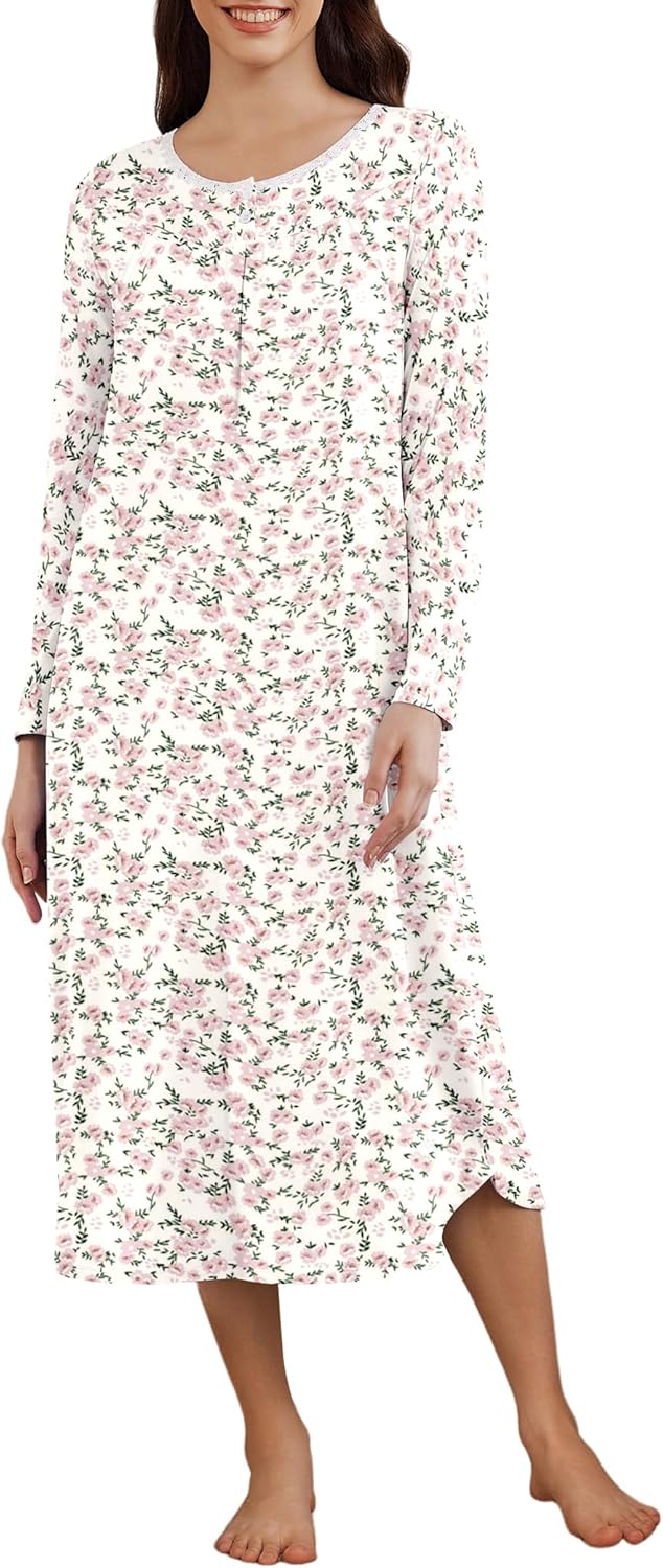 Ekouaer Women's Long Sleeve Nightgown Long Sleepshirt Henley Nightgowns Full Length Sleep Dress with Pockets S-3XL