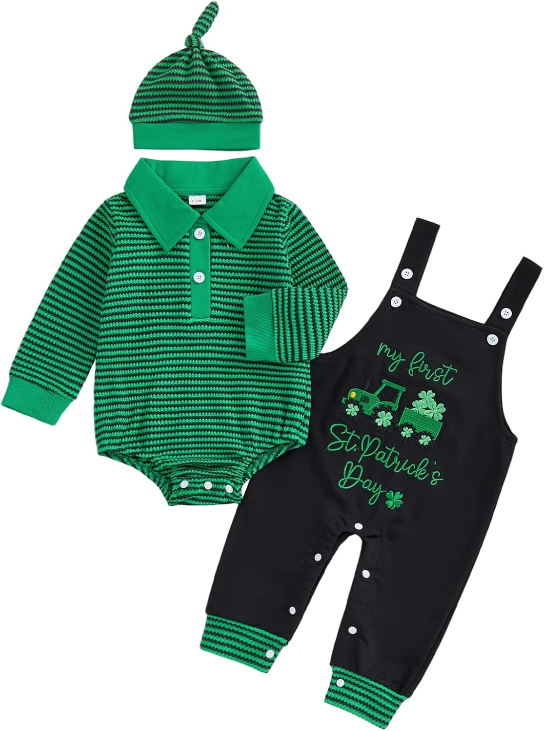 BeQeuewll My First Easter Baby Boy Outfit Infant Stripe Romper Bunny Letter Embroidery Overalls Pants Set Newborn Outfits