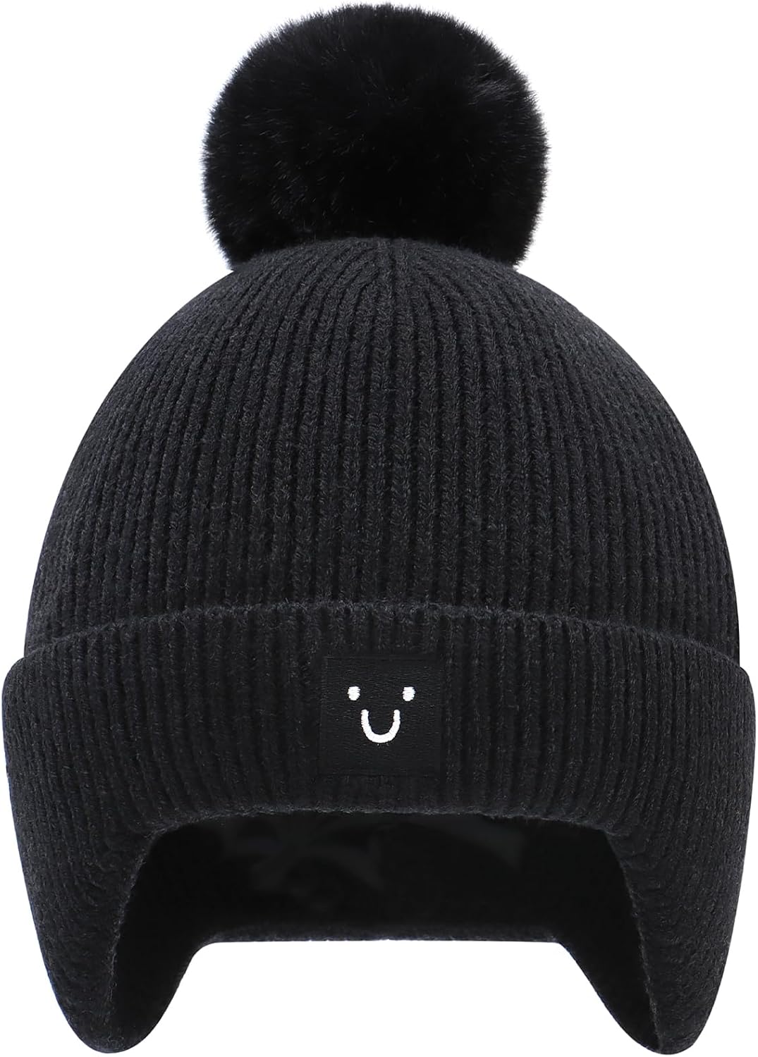 Baby Beanie with Ear Flaps pom pom Smiley Embroidery- Skin Friendly Fleece Lining Winter hat for Infant 0-24M