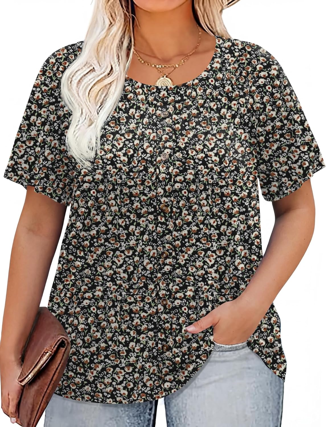 AKEWEI Womens Plus Size Tops 2026 Summer Short Sleeve Pleated Shirts Crew Neck Casual Loose Blouses Tunic XL-5XL