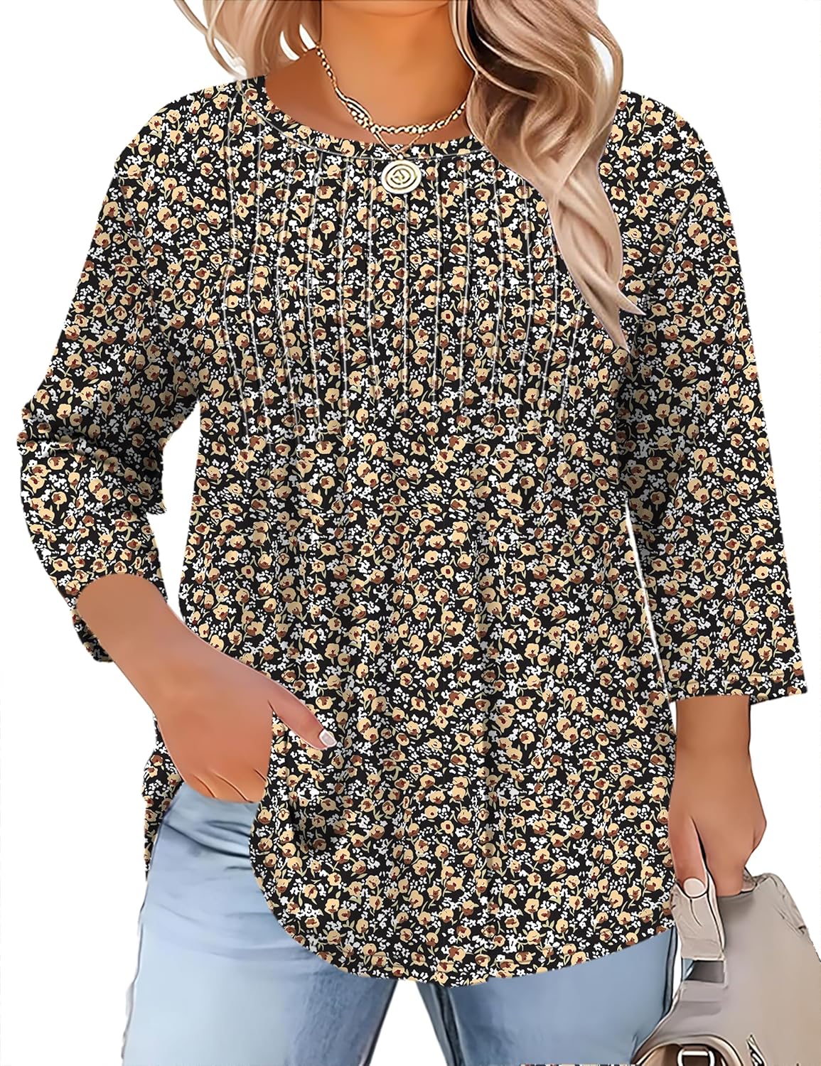 TFSDOD Womens Plus Size Tops 3/4 Length Sleeve Womens Tops Crewneck Pleated Boho Tunic Casual Shirts XL-5X