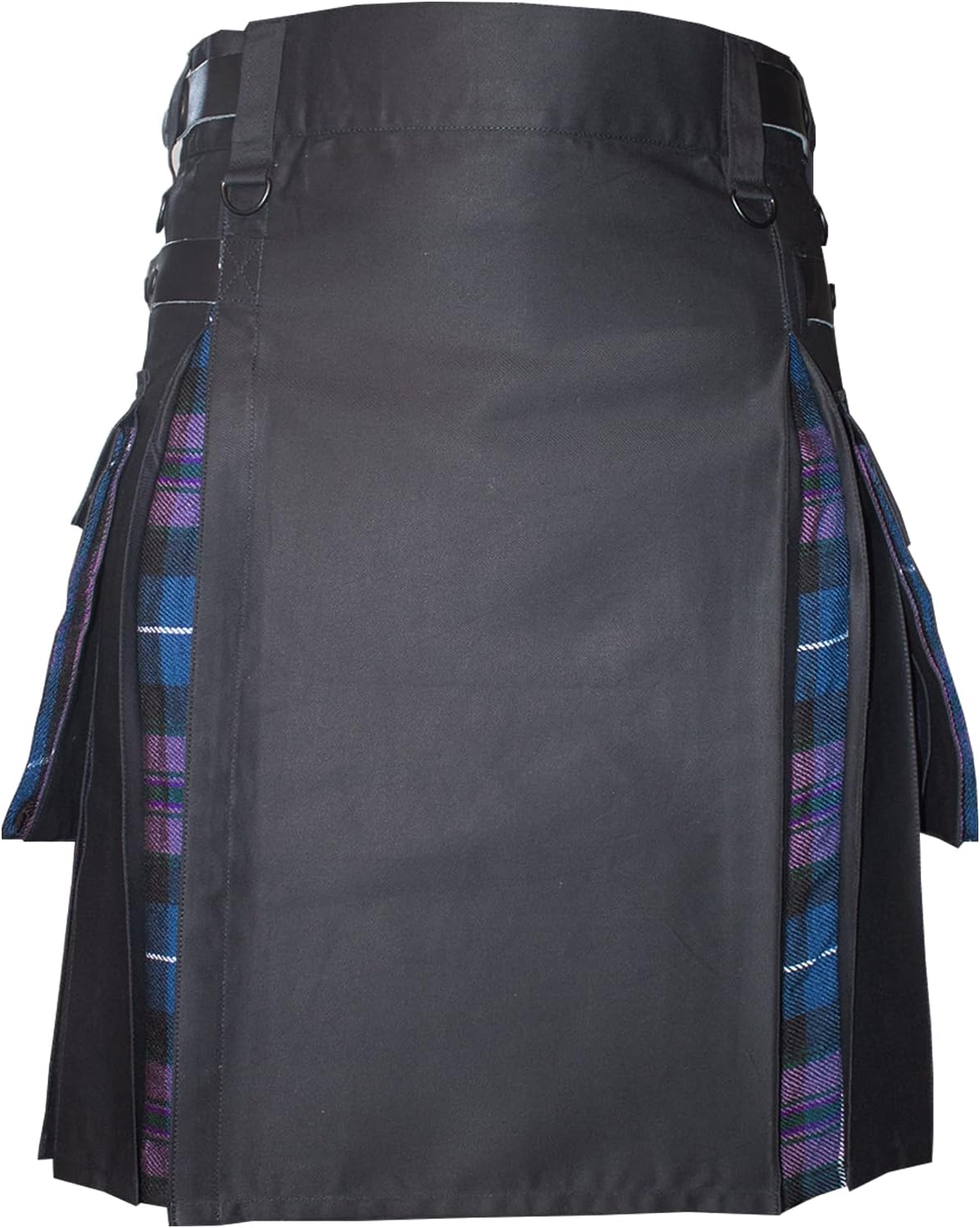 Modern Utility Kilts-Men'sScottish Hybrid Black Cotton & Acrylic Wool Tartan Utility Kilts with Leather Straps