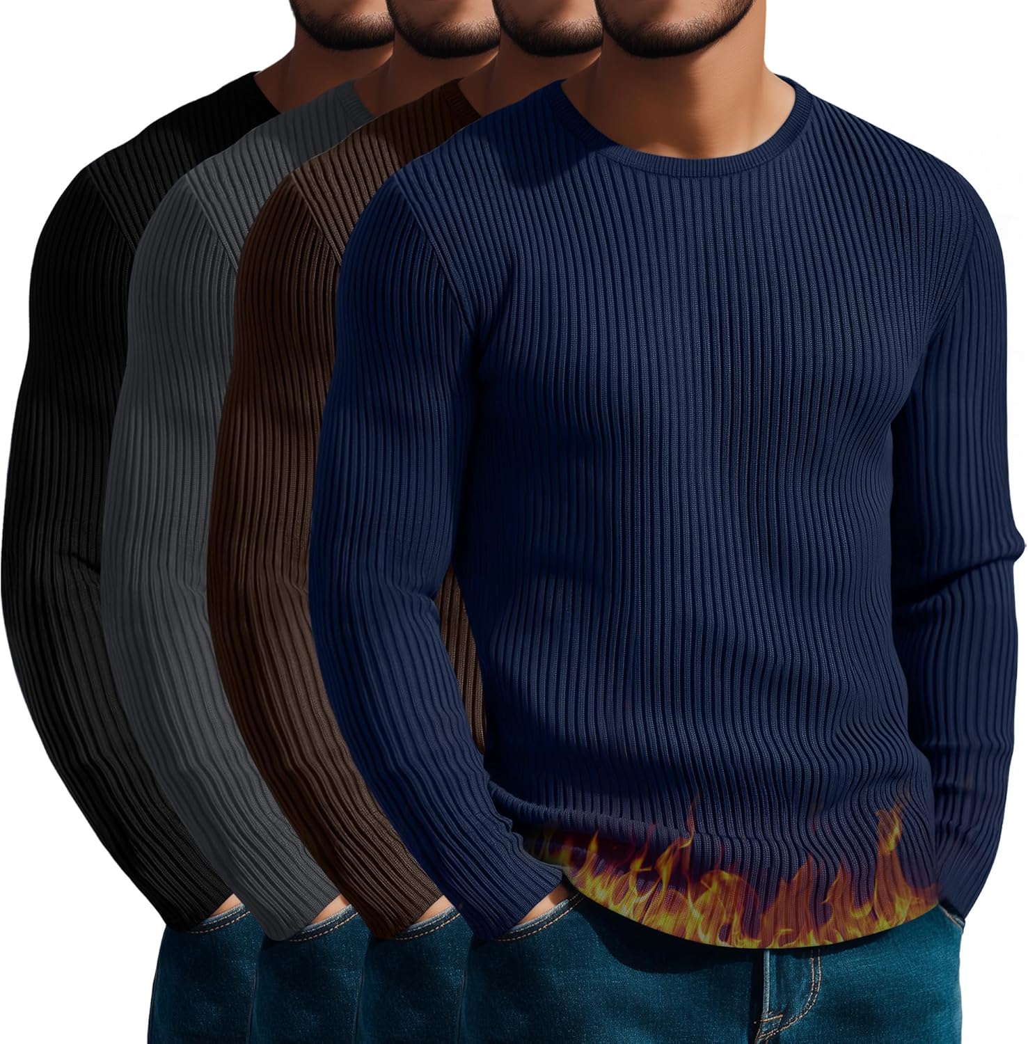 4 Pack Men's Cotton Thermal Long Sleeve Shirts Ribbed Crew Neck Tops Slim Fit Undershirts Fall Winter Base Layer