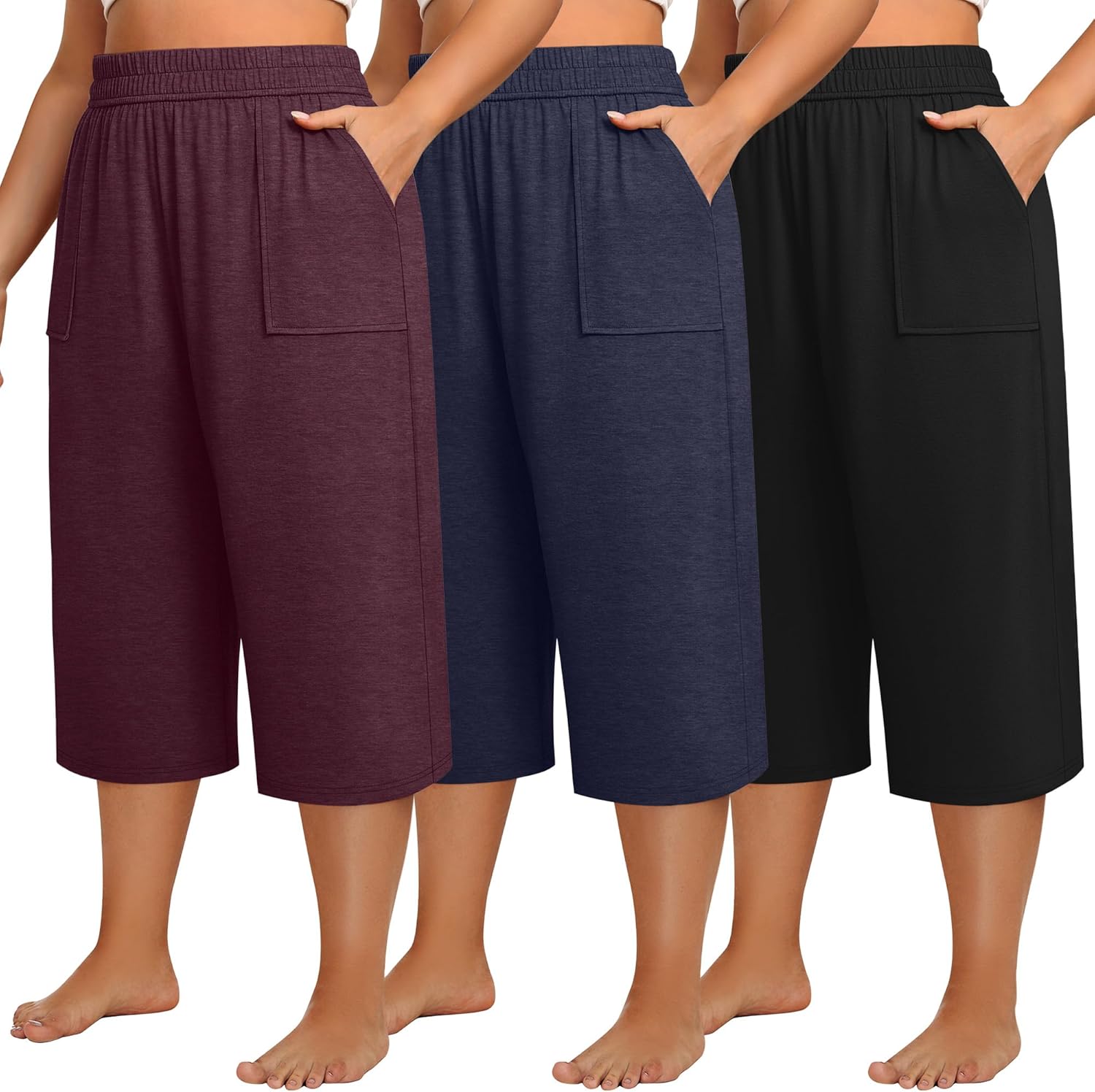 Neer 3 Pack Women Plus Size Capris Cotton Wide Leg Cropped Pants Casual Elastic Waist Loose Fit Lounge Sweatpants with Pocket