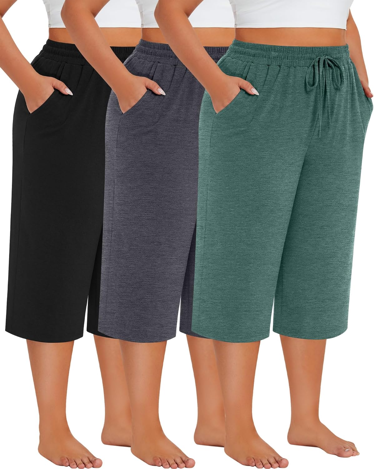 Neer 3 Pack Women's Plus Size Cotton Capris, Stretchy Wide Leg Cropped Pants with Pockets Loose Lounge Pajama Sweatpants