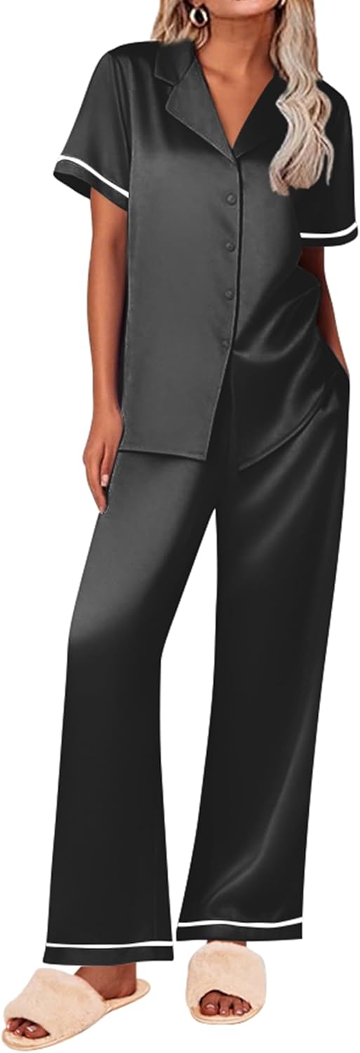 Ekouaer Women's Silk Pajamas Set Short Sleeve Satin Pjs 2 Piece Soft Loungewear with Pants Button Down Sleepwear,Black,M
