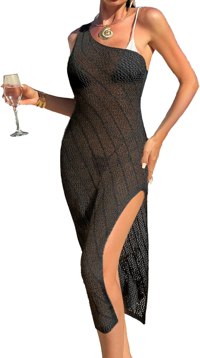 Womens Crochet Striped Knit Swimsuit Coverup Midi Dress Summer 2025 One Shoulder Slit Beach Bathing Suit Cover Up