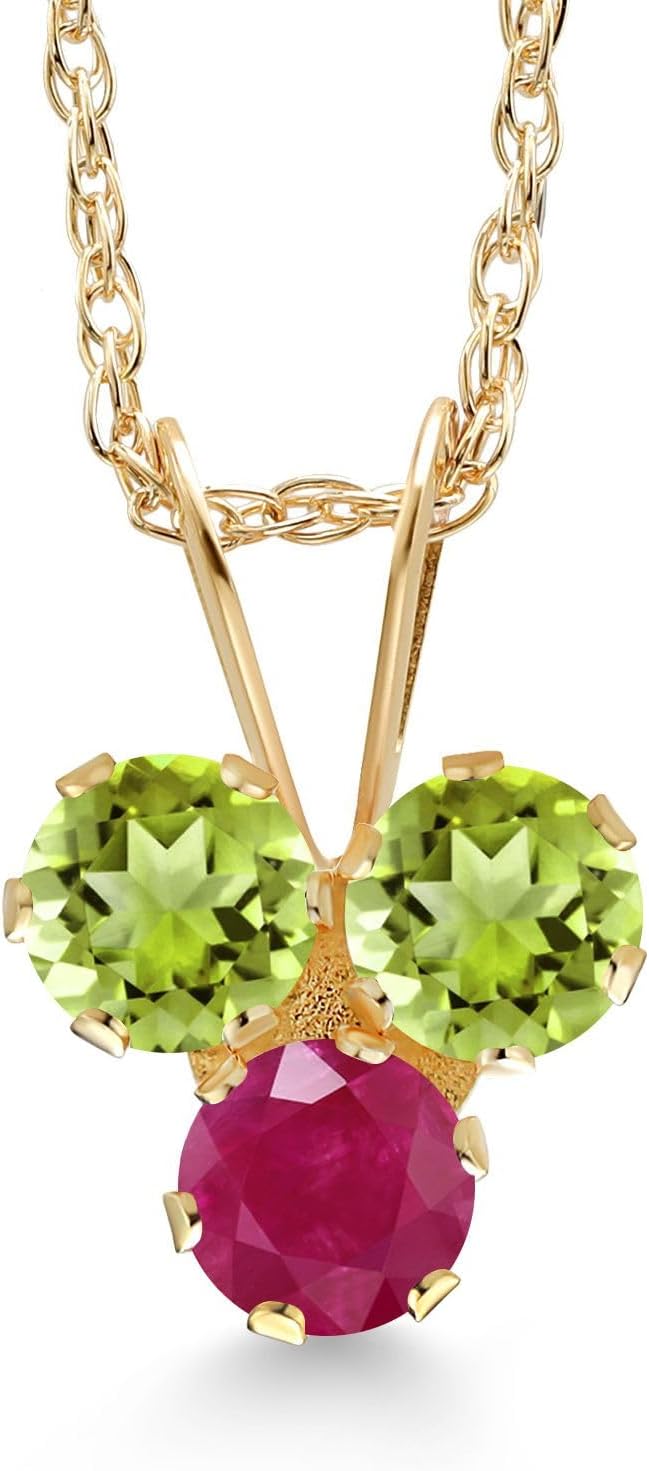 Gem Stone King 14K Yellow Gold Green Peridot and Red Ruby 3-Stone Pendant Necklace For Women (0.40 Cttw, Gemstone August Birthstone, Round 3MM, 18 Inch Chain)