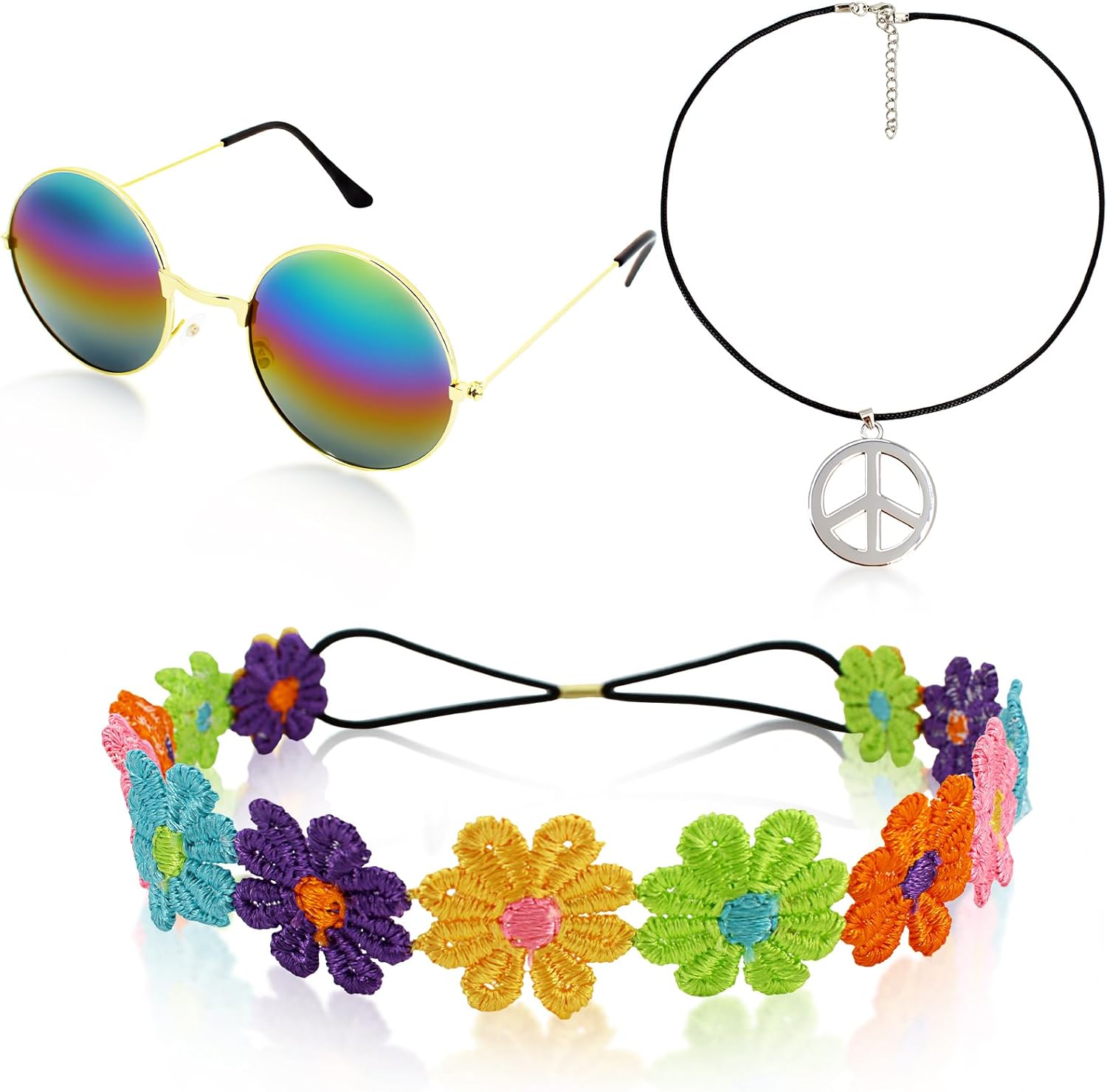 3 Pcs Hippie Costume Accessory for Women,70s Accessories Women Peace Sign Necklace,Headband Hair Wreath and Hippie Sunglasses Set,60s 70s Hippies Friends Gifts Disco Party Decorations Multicolored
