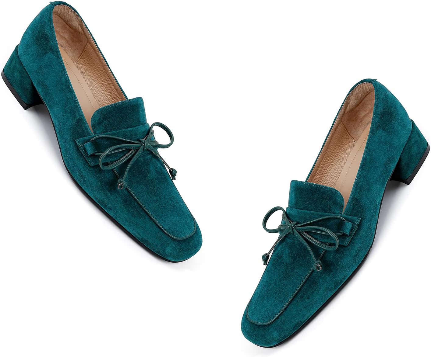 MOOMMO Women Chunky Low Heel Loafers Bow Suede Slip On Closed Square Toe Loafer Shoes Oxfords Comfy 1 Inch Block Heels Dress Shoes Pumps Office Work Pumps Vintage Retro Teal 7.5 M US