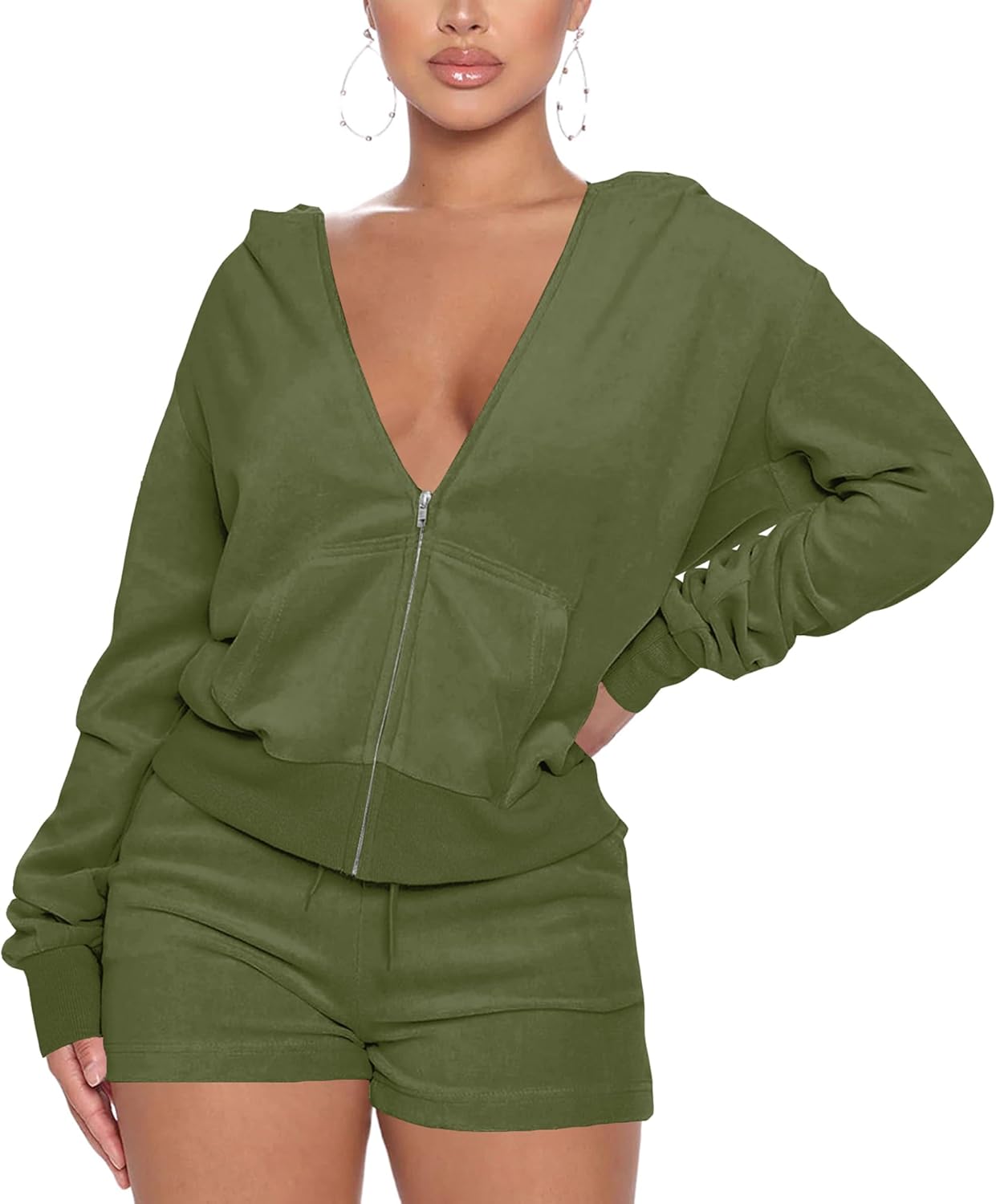 SMSN Women 2 Piece Outfits Sweatsuit Shorts Sets, Velvet Tracksuit Long Sleeve Hooded Zipper Jacket Casual Sweat Set