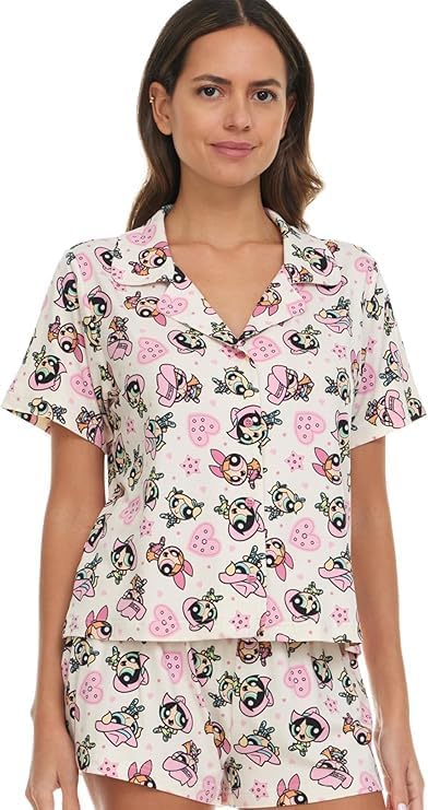 COCO BRANDS Womens Pajama Sets - 2 Piece Powerpuff Girls Soft Stretch Button Down Sleep Shirt and Pajama Shorts (Sizes: S-XL)
