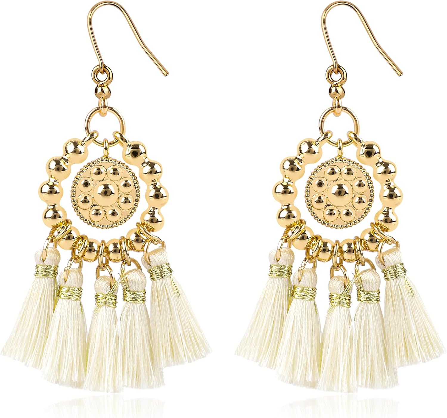 Bohemian Dangle Tassel Earrings for Women 14K Gold Plated Tassel Gold Ball Beads Hoop Fringe Chandelier Earrings Beaded Circle Hoop Boho Statement Earrings Handmade Party Jewelry Gift for Teen, Beige