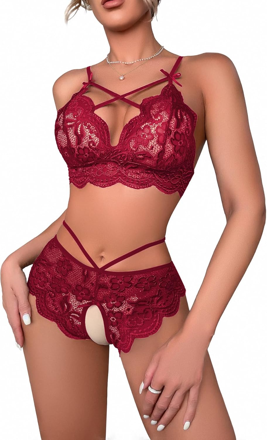 Lilosy Sexy Crotchless Strappy Women Floral Lace High Waist Pajamas Lingerie Set