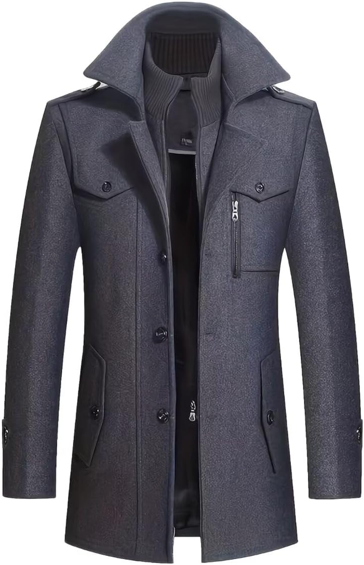 INVACHI Men's Trench Coat Wool Blend Single Breasted Peacoat Thermal Business Winter Coat with Removeable Collar
