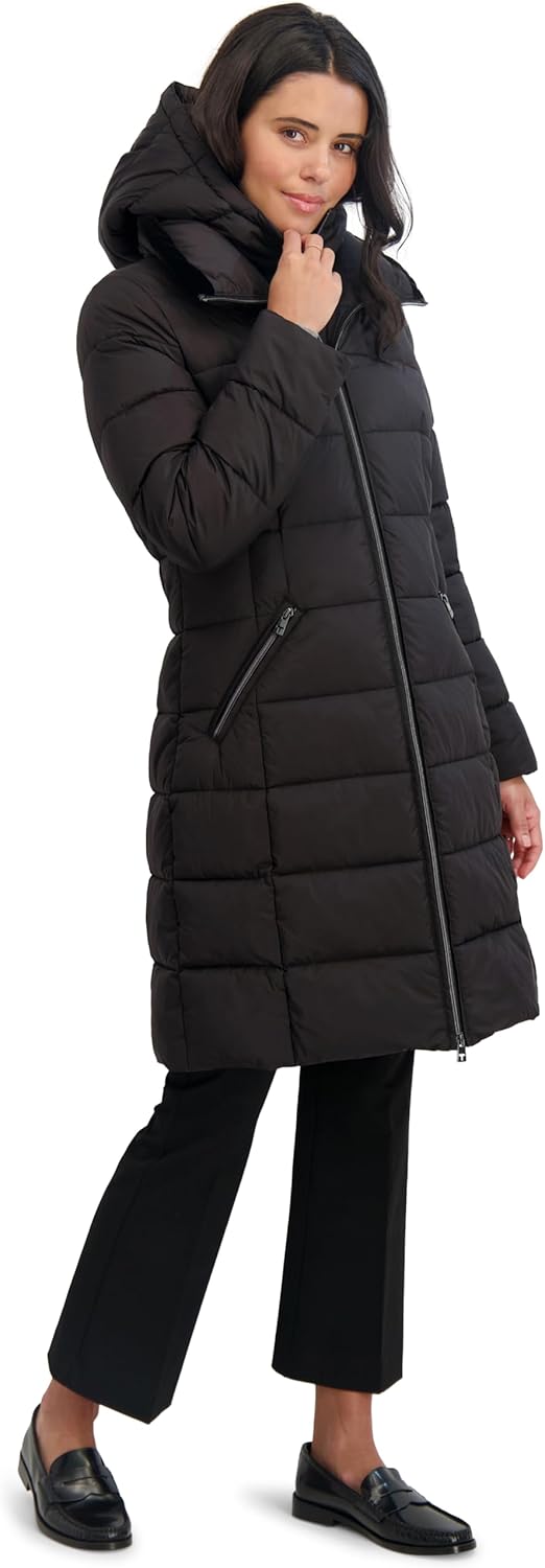 TAHARI Women's Slim Quilted Puffer Coat with Attached Hood, Velvet Bib Insert & Zipper Closure, Black, X-Small