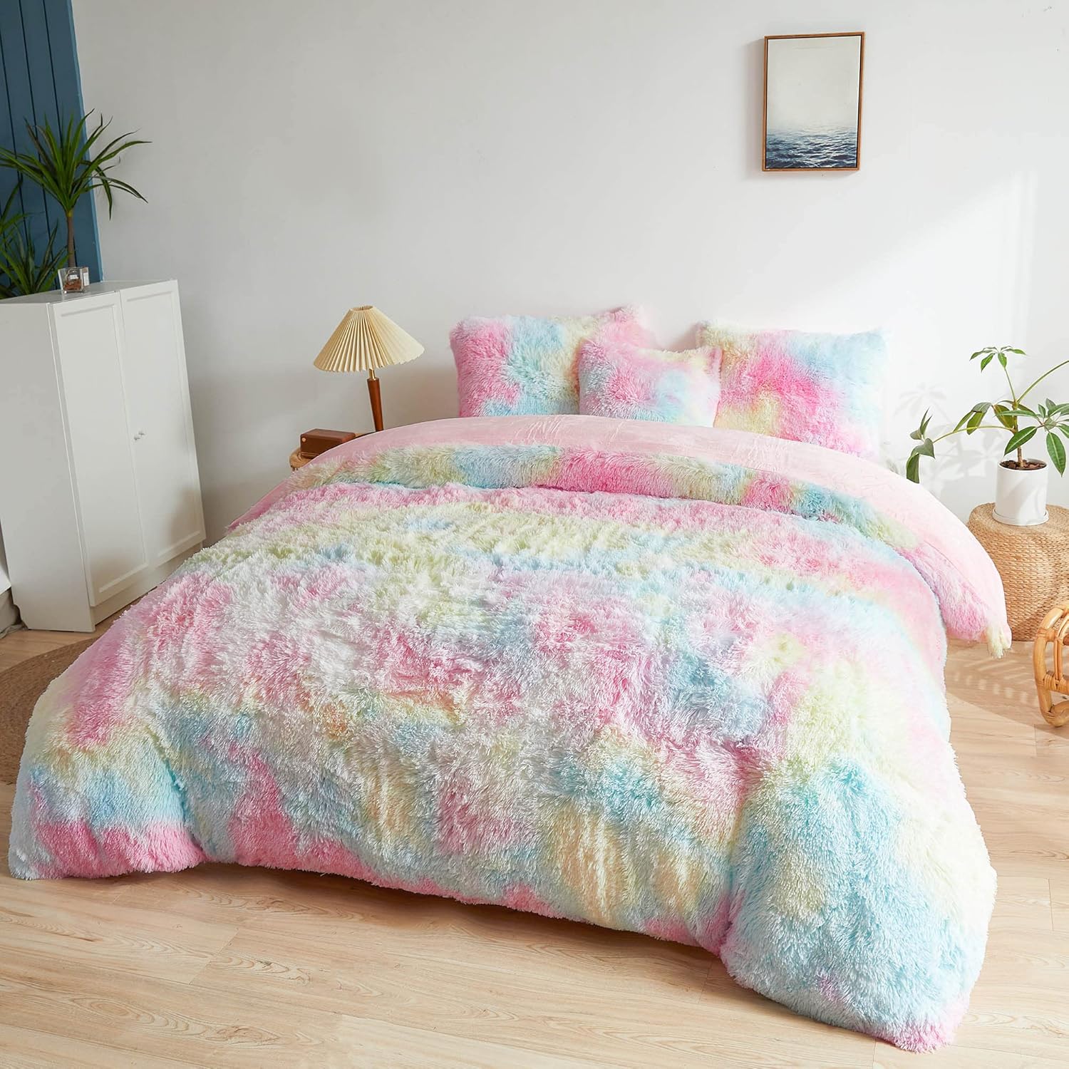 MEGO Rainbow Fluffy Plush Duvet Cover Set, Tie Dye Print Faux Fur Comforter Cover, Soft Multicolor Shaggy Bedding Set for Teens Kids Girls Child, 1 Fuzzy Duvet Cover + 2 Furry Pillowcases, Queen Size