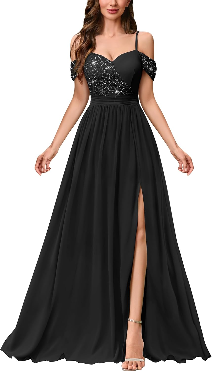 Miusol Women's Off Shoulder Elegant Sequined Split Spaghetti Straps Wedding Maxi Dress