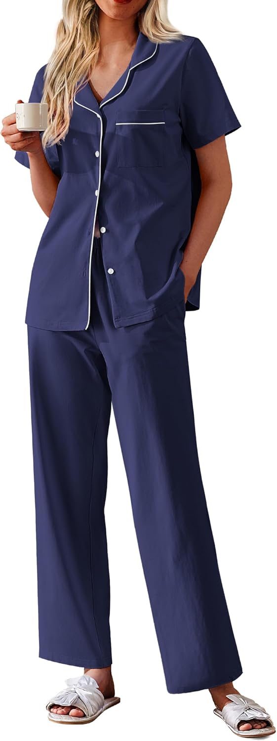 Ekouaer Women's 100% Cotton Pajamas Set Short Sleeve Button Down Pjs 2 Piece Soft Sleepwear with Long Pants Lounge Set
