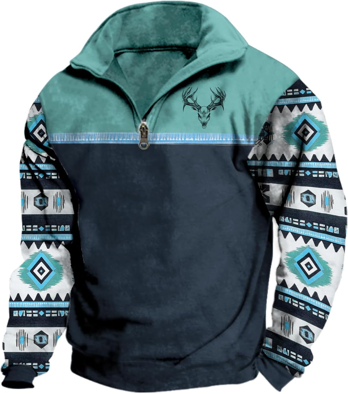 Aztec Cowboy Mens Hoodie Vintage Graphic Western Hoodies Casual Long Sleeve 1/4 Zip Pullover Mens Country Jacket