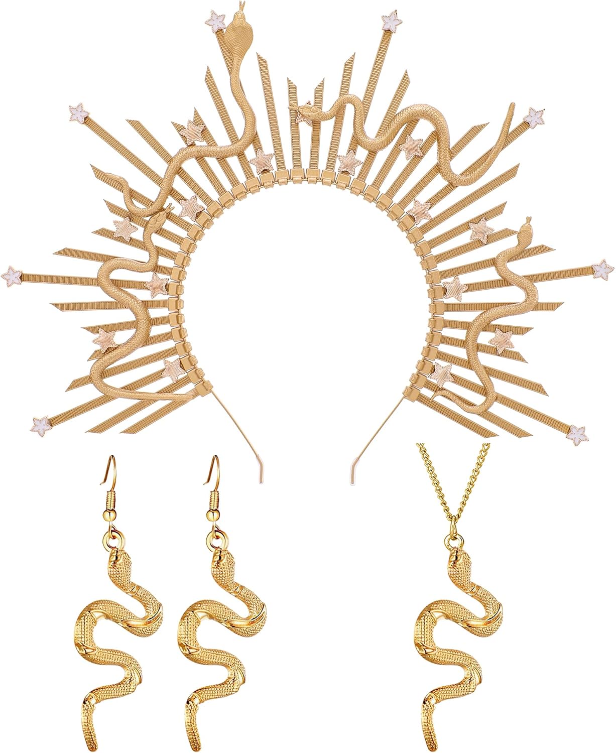Halloween Medusa Costume Accessories Set, 3 Pcs Renaissance Gold Sunburst Witch Snake Halo Crown with Earring Necklace, Renfaire Sun Greek Goddess Headpiece for Women Cosplay Party