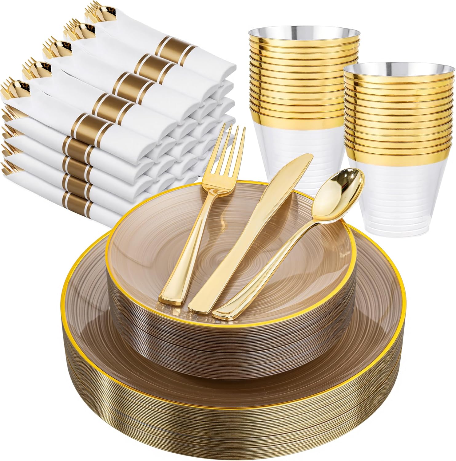 - Value Pack:This plastic dinnerware sets include 25 dinner plates, 25 salad plates, 25 knives, 25 forks, 25 spoons, 25 cups, 25 napkins. Clear disposable plates are packed in a solid gift box. The set of gold party plates will allow you to entertain 25 guests.