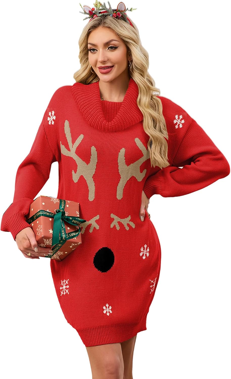 SunnyMelody Womens Christmas Funny Ugly Sweater Dress Winter 2025 Vacation Outfits Oversized Turtleneck Xmas Mini Dresses