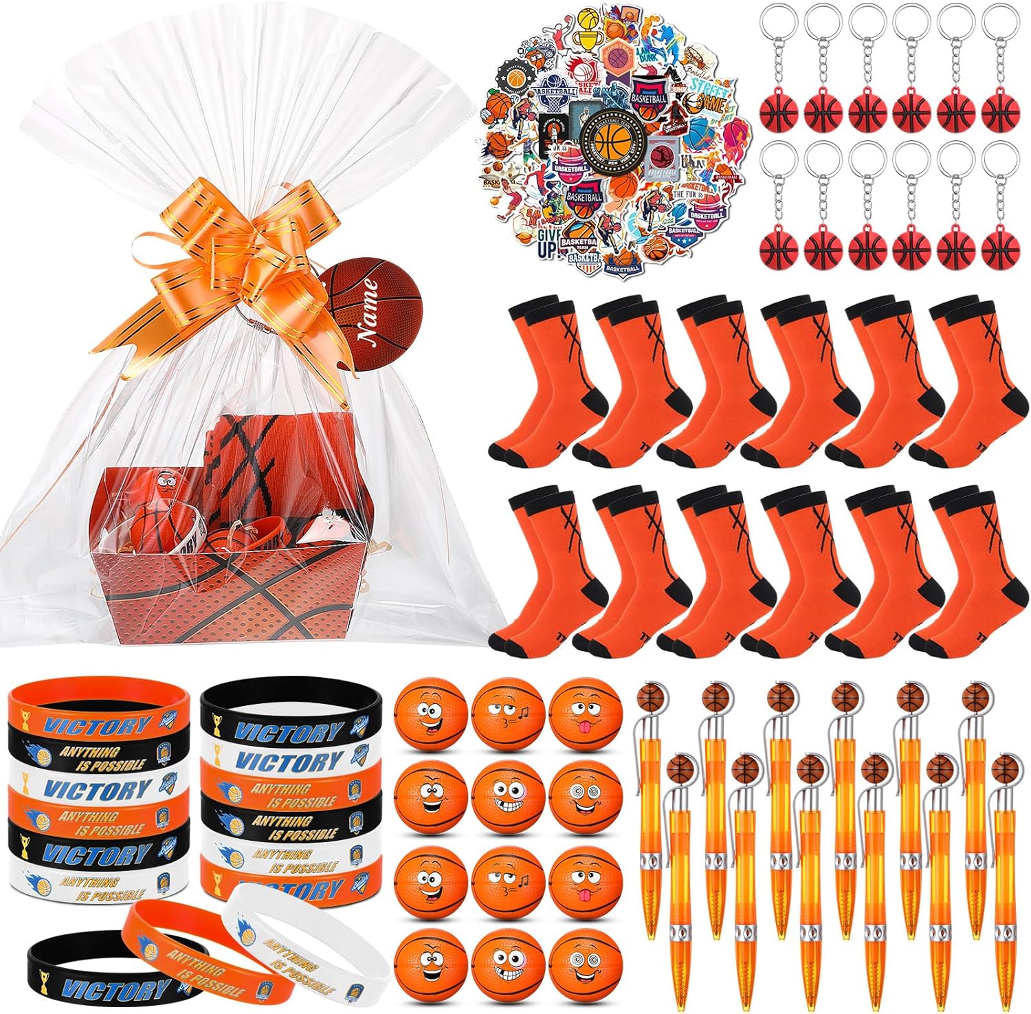 - Basketball Party Favors Set: there are a total of 158 pieces of basketball party supplies, including 12 pieces of basketball empty gift baskets, 12 pairs of basketball socks, 12 pcs basketball bracelets, 12 pcs basketball keychains, 50 basketball stickers, and other basketball goodie bags stuffers, different items with adequate quantity to satisfy your diverse and basketball party using, decorating and sharing needs
