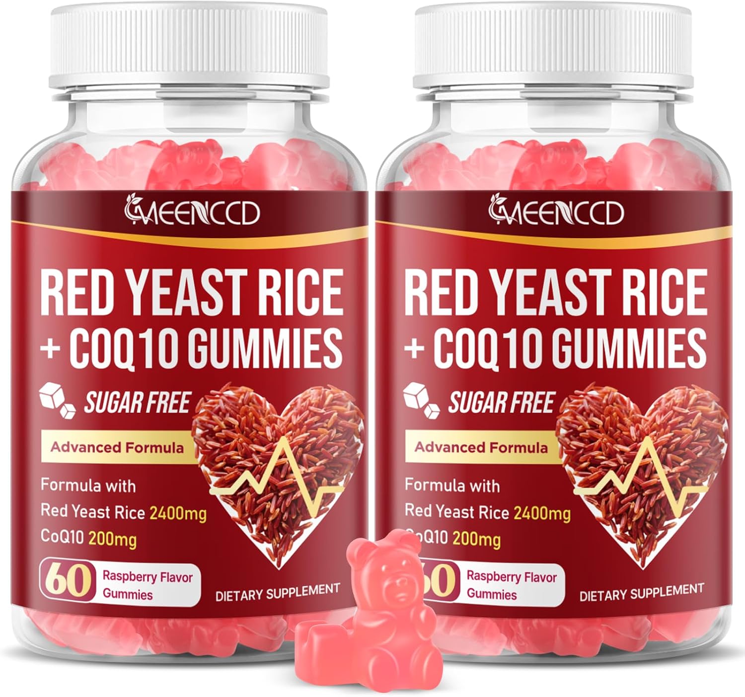 2 Pack Red Yeast Rice with CoQ10 Gummies, Red Yeast Rice Supplement with Coenzyme Q10 for Overall Well-Being & Vitality, Sugar Free, Vegan, Raspberry Flavor, 120 Count