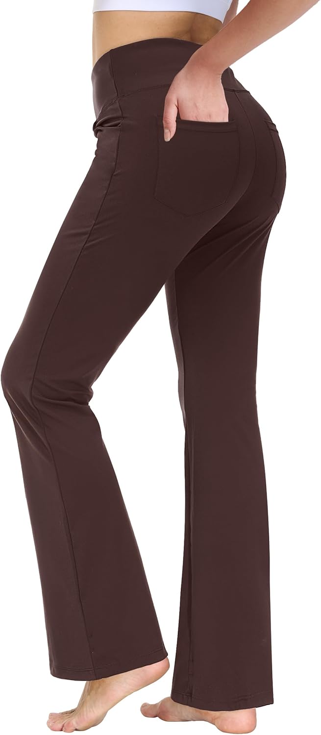 nuveti 27"/29"/31"/33"/35"/37'' High Waist Workout Bootleg Yoga Pants Tummy Control 4 Pocket Workout Yoga Pants Flare Leggings (Darkbrown XXL 27'')