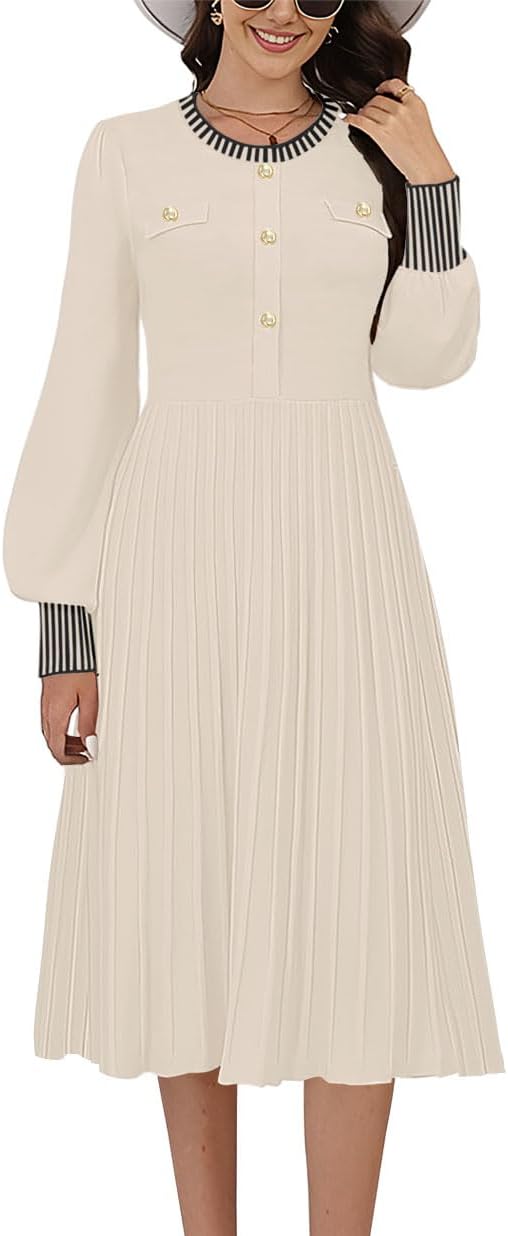ETCYY Women's Casual Long Sleeve Midi Dress 2025 Striped Fall Sweater Work Button Pleated A Line Ribbed Knit Dresses