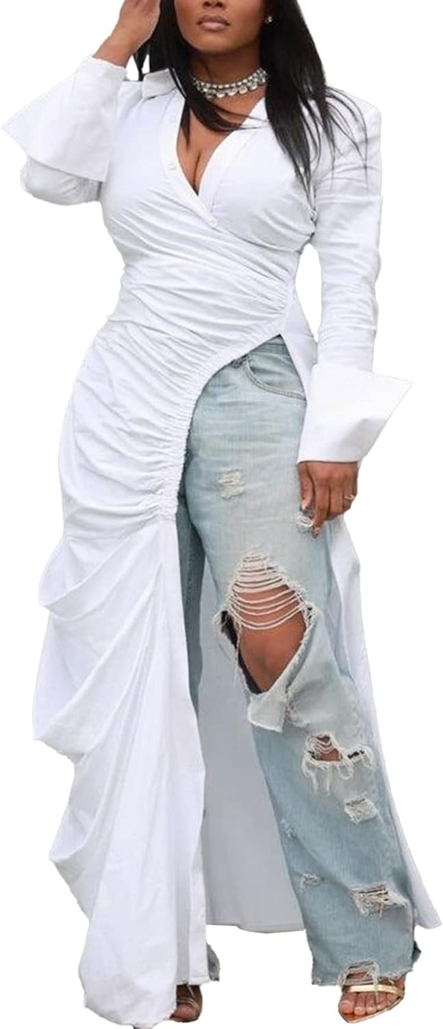 Seltaon Sexy Shirt Dresses for Women High Low Asymmetrical Tops Long Sleeve T Shirt Dress