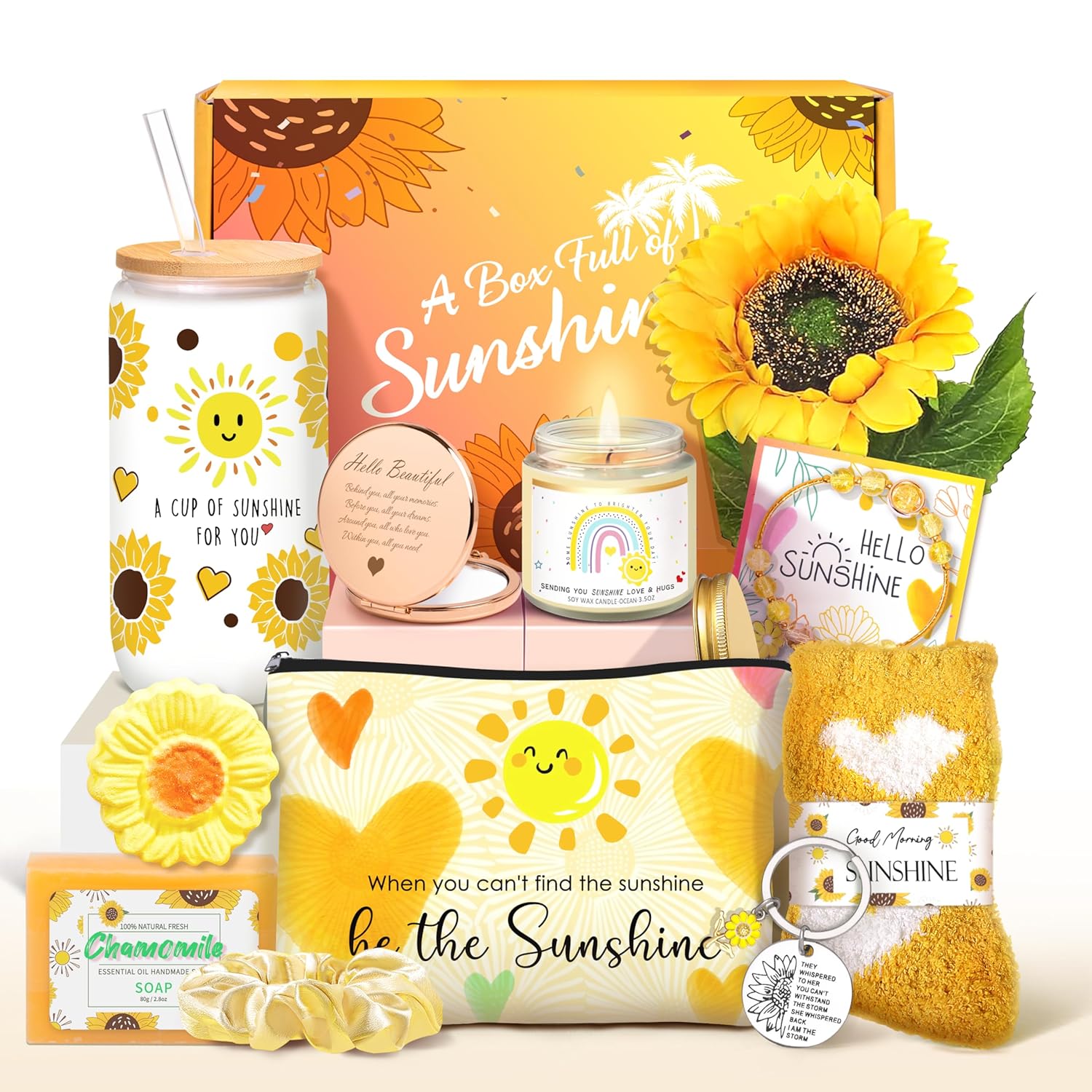 - FEEL BETTER GIFTS FOR WOMEN-The 16 oz sunflower glass cups with "A CUP OF SUNSHINE FOR YOU" is made of high -quality glass and is the perfect choice for hot and cold beverages. The lavender candle is made of pure plant essential oil. The sunflower -colored cosmetic bag is printed with "When you can‘t find the sunshine be the Sunshine". The furry socks provides warmth and comfort all day. With "HELLO SUNSHINE " bracelet.All design symbolizes your love and support.