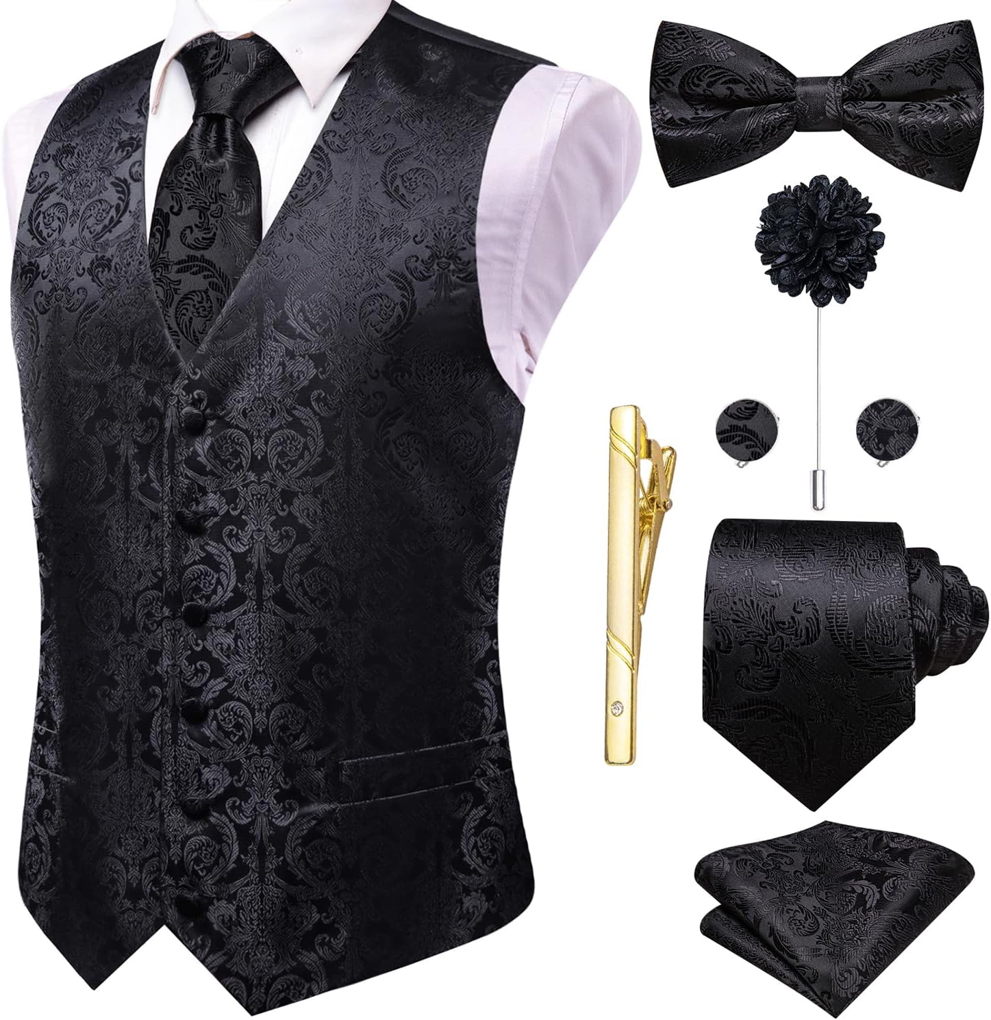 Hi-Tie Silk Mens Suit Vest Tie and Bowtie Lapel Pin Gold Tie Clip Paisley Floral Waistcoat 8PCS Set Tuxedo Wedding Party