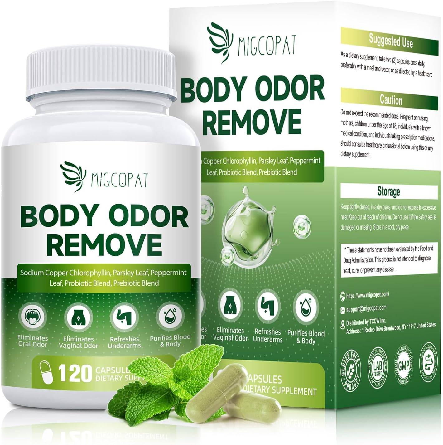- CHLOROPHYLL BODY DEODORIZING CAPSULES: Migcopat’s internal deodorant chlorophyll capsules features 600mg of sodium copper chlorophyllin, combined with parsley leaf, peppermint, and green tea extracts. This advanced botanical formula supports internal cleanliness, helping to neutralize body odor and naturally freshen breath from the inside out—ideal for those looking to stay fresh, confident, and odor-free all day long.