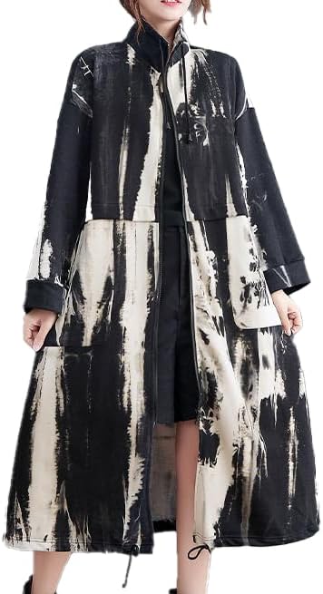 ellazhu Women's Coats Retro Trench Mock Neck Long Sleeve Oversize Zip up Printed Long Maxi Hem Side Pockets GZ624 A