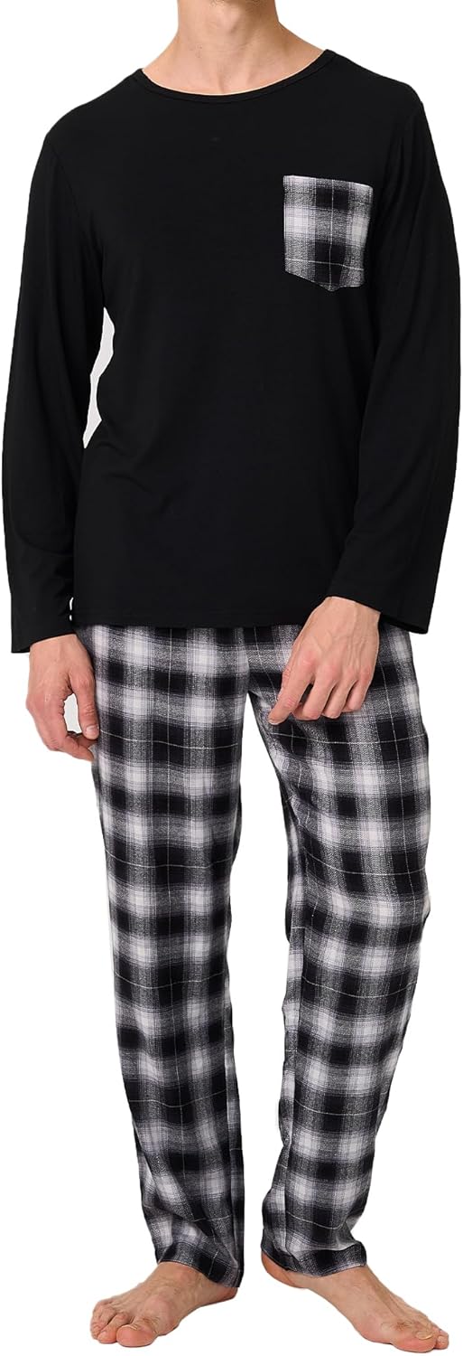 BAMBOO COOL Mens Christmas Pajamas Set Plaid Pjs Pijama Soft Lightweight Sleepwear Long Sleeve Woven Pants with Pockets