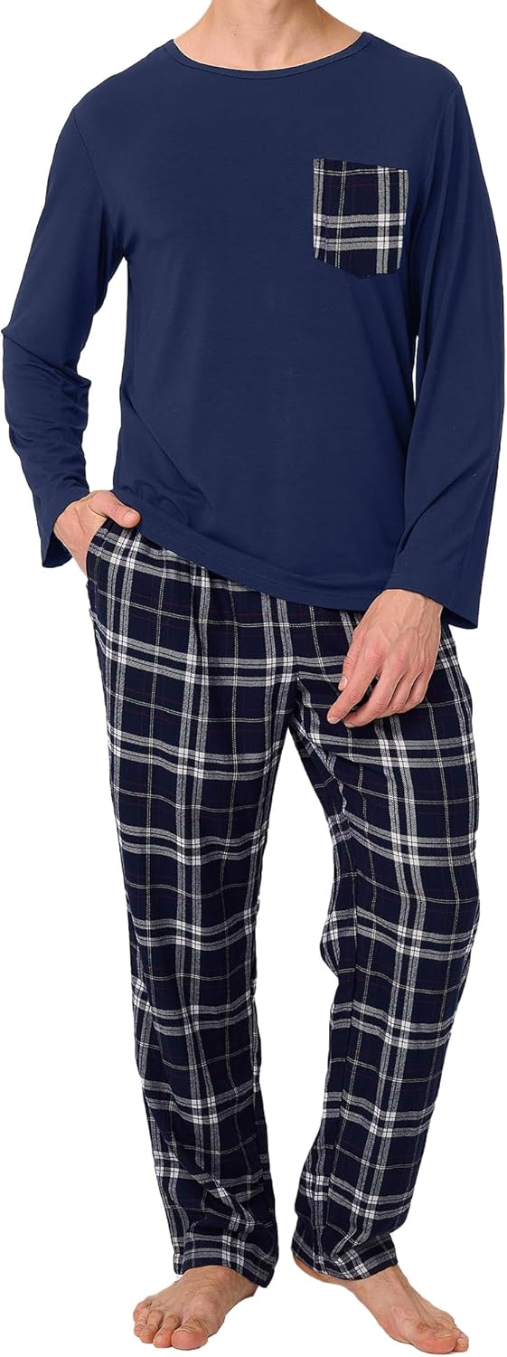 BAMBOO COOL Mens Christmas Pajamas Set Plaid Pjs Pijama Soft Lightweight Sleepwear Long Sleeve Woven Pants with Pockets