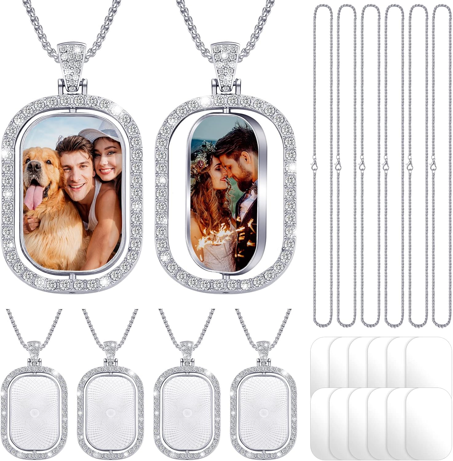 - Nice Rhinestone Bezel Trays Charms Set: the package comes with 6 pieces pendant trays for jewelry making and 6 pieces thick chains, 12 pieces sublimation blank discs, 24 pieces in total, meeting your various DIY and decoration needs in daily life