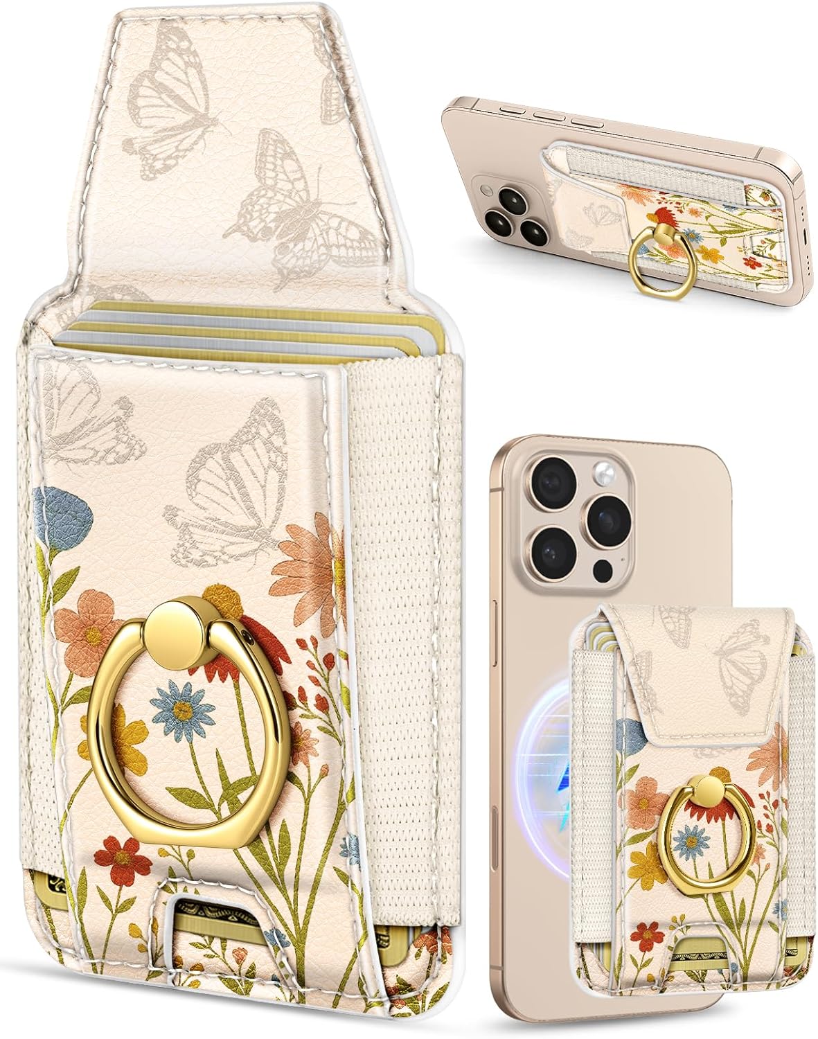 Shorogyt Compatible with Magsafe Wallet with Ring Stand Grip - Cute Magnetic Phone Wallets Card Holder for iPhone 17/16/15/14/13/12 Series for Women Girls Retro Wildflowers Design, Fit 7 Cards