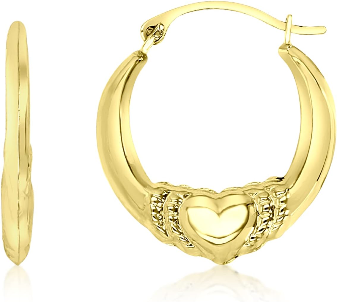 14K Yellow Gold 2x20mm Small Diamond Cut or Swirl Heart Lightweight Hoop Earrings