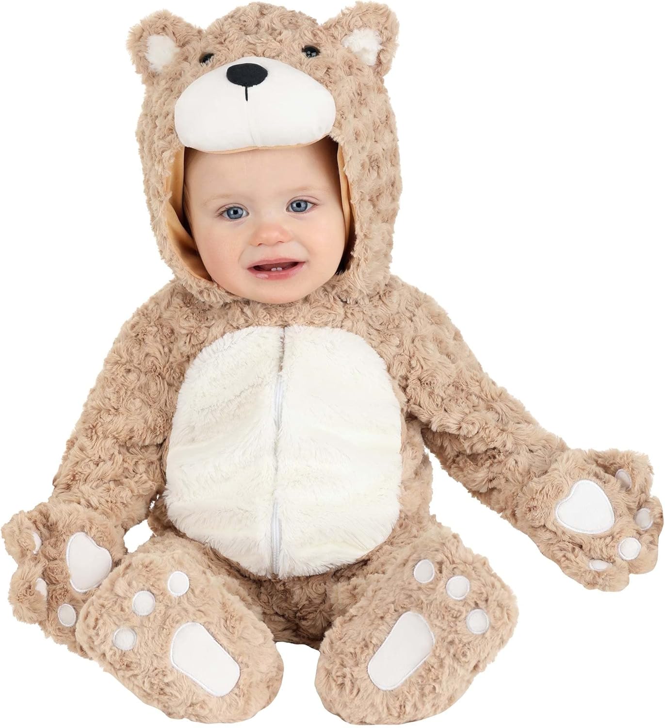 Teddy Bear Costume for Babies, Plush Hooded Tan Bear Jumpsuit with Ears and Mitts Halloween Outfit