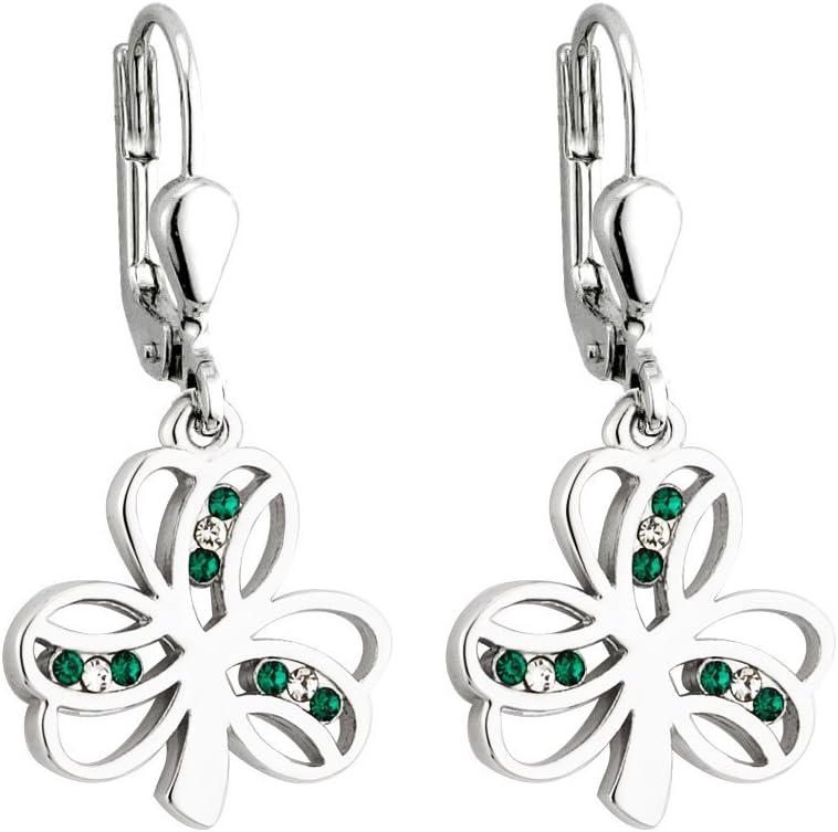 Shamrock Earrings Rhodium Plated &Green Crystal Drops Irish Made by