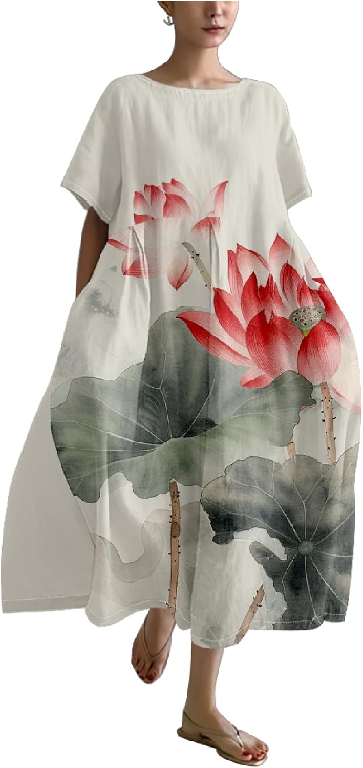 MARSVOVO Summer Casual Dresses Boho Floral Print Short Sleeve Loose Crew Neck Plus Size Party Dresses for Curvy Women