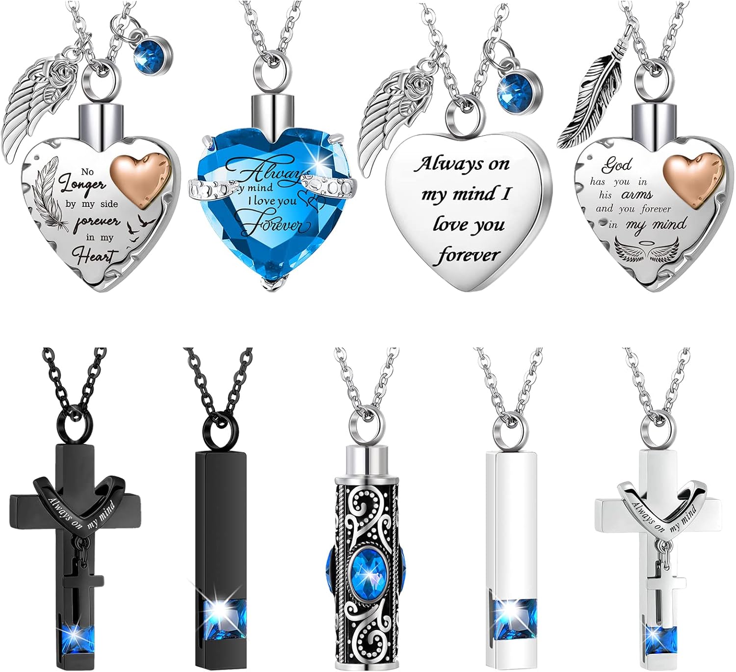 9 Pcs Heart Cross Cubic Urn Necklace for Ashes Keepsake Cremation Jewelry Stainless Steel Necklace Crystal Memorial Pendant Heart Locket Ashes Jewelry for Women Men Loved Ones, 9 Styles