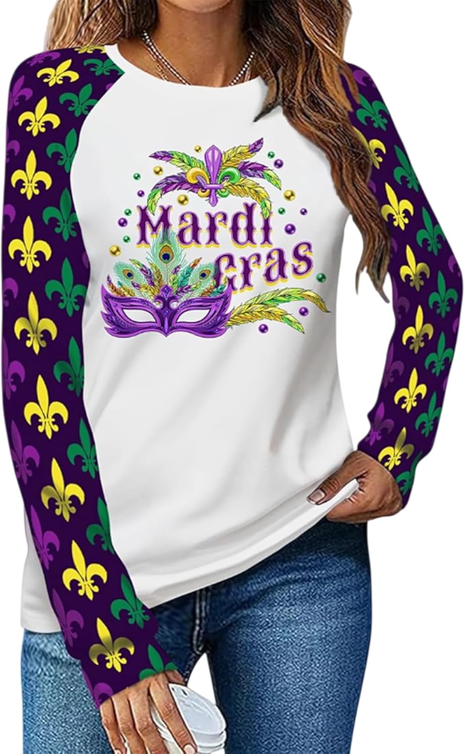 jusgai Mardi Gras Shirts for Women-Fat Tuesday Long Sleeve T Shirt Carnival Party Outfit Tops